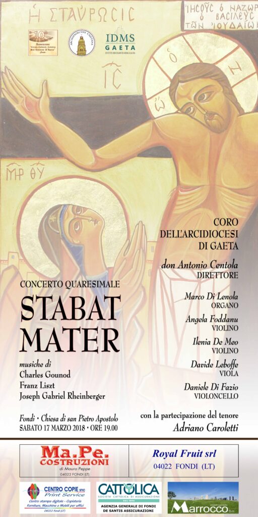 L’Istituto Diocesano di Musica Sacra ha organizzato per sabato 17 marzo alle ore 19,00 il concerto quaresimale “Stabat Mater” nel quale verranno eseguite musiche di A. Concesa-M. Ruggeri, C. Gounod, F. Liszt e J. G. Rheinberger. Sarà la ex cattedrale di San Pietro Apostolo in Fondi, con la sua storia e la sua arte, ad accogliere l’appuntamento che vedrà quale interprete il Coro dell’Arcidiocesi di Gaeta, diretto da don Antonio Centola, accompagnato all’organo da Marco Di Lenola e da un quartetto d’archi (Angela Foddanu, Ilenia De Meo, Davide Leboffe e Daniele Di Fazio). Il concerto vedrà la partecipazione del tenore Adriano Caroletti, cantore della Pontificia Cappella Musicale Sistina e Direttore della Cappella Musicale Lauretana.
